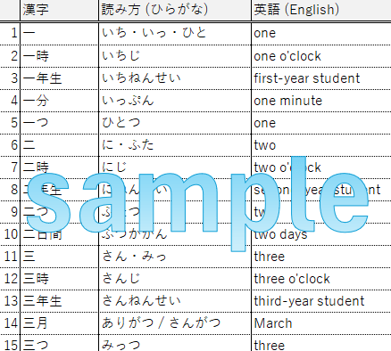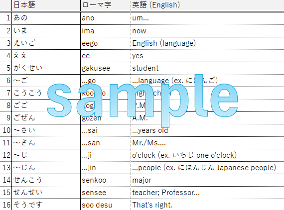 エクセルデータの各課の新出語彙や漢字には、ふりがな・英語も記載しております。